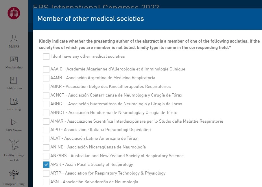 - Must submit their abstract by 15 February 2022, choosing "APSR - Asian Pacific Society of Respirology", (see image on the right) not their society's name.