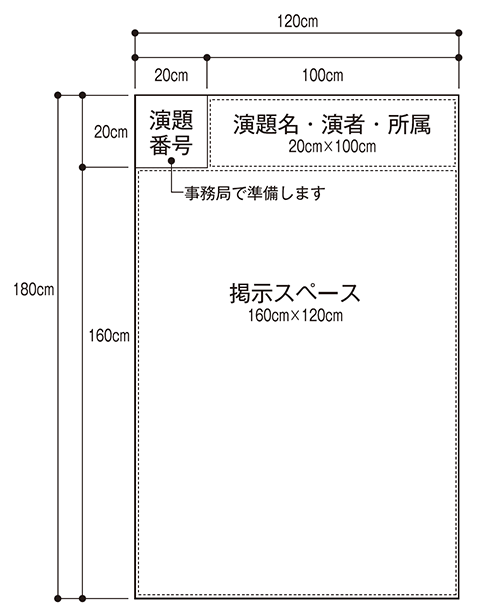 | ポスター発表 | ポスター掲示・発表 1題あたり5分(発表3分、質疑2分を目安)でご準備ください。 ポスター掲示板の大きさは横120㎝×縦180㎝です。演題名・演者・所属は横100㎝×縦20㎝でご準備ください。 参加者への配布用に、発表内容をA4またはA3用紙1枚にまとめたものを30部ほどご用意ください。 ![]() |